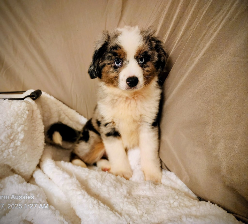 Available Mid September – Fiona X Bentley Large Toy/Small Mini Australian Shepherds with tails Born 7/12/2025