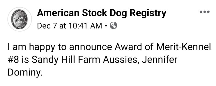 We have received all 4 of the Awards of Merit offered from the American Stock Dog Registry: