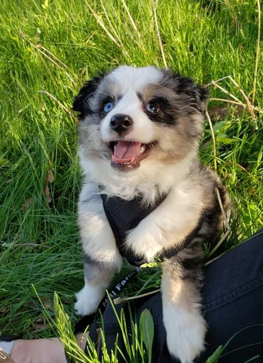 For almost a decade I was on the lookout for an Australian Shepherd. I have a condition that causes me to have episodes of anxiety. I knew having a pet could give me not only a distraction and something to care about, but a companion too. After moving back into my childhood home with a nice backyard, I decided it was time to begin my search, for real. I opened my laptop and searched for available puppies on a few sites. As soon as I saw this gorgeous blue merle puppy, I knew I had to have him. His adorable heart shaped nose and mix matched eyes won my heart.