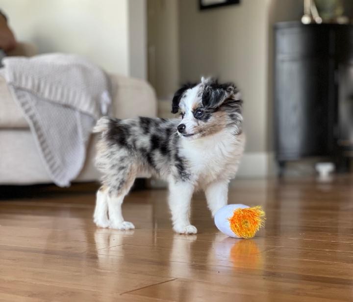 I adopted my mini black tri almost a year ago. I could not be any more happy with my baby. A bit larger than a toy, he is the perfect size for me. He has such a wonderful temperament that my vet asked me who my breeder was. She said not many Aussies are as well tempered as mine. He loves all people and creatures and is quite the snuggle bug. Indy is heathy, handsome and so smart. We get compliments all the time. I can never thank Jennifer enough for choosing me to join her puppy family. My guy was exactly what I was searching for.